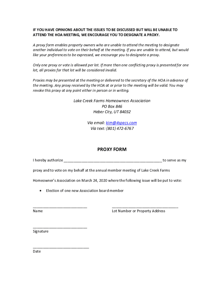 IF YOU HAVE OPINIONS ABOUT THE ISSUES TO BE DISCUSSED BUT WILL BE UNABLE TO ATTEND THE HOA MEETING, WE ENCOURAGE YOU TO DESIGNATE A PROXY. A proxy form enables property owners who are unable to attend