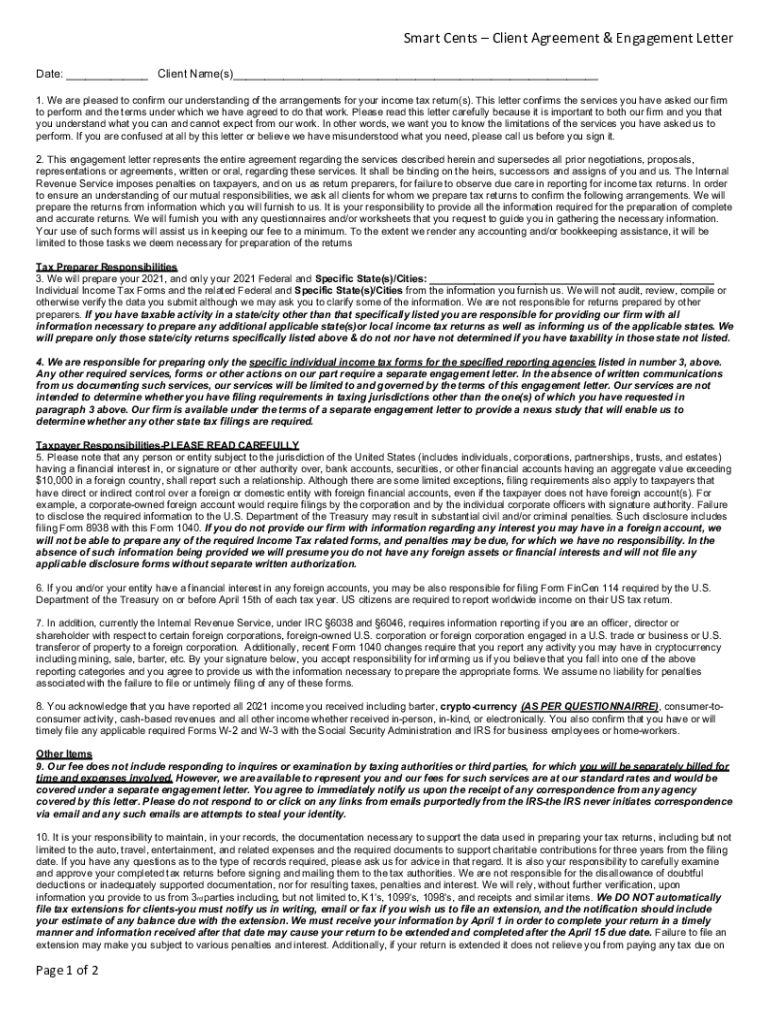 Smart Cents Client Agreement & Engagement Letter Date: ___ Client Name(s)___ 1. We are pleased to confirm our understanding of the arrangements for your income tax return(s). This letter confirms
