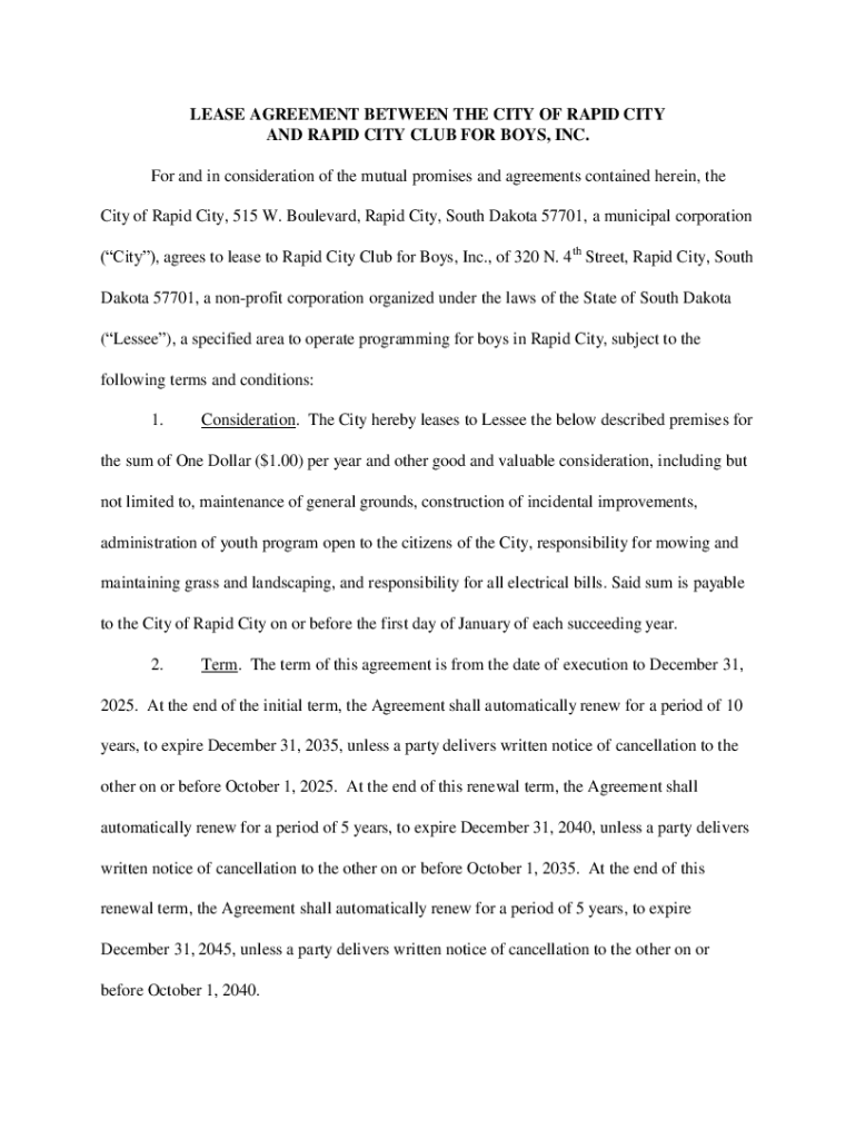 LEASE AGREEMENT BETWEEN THE CITY OF RAPID CITY AND RAPID CITY CLUB FOR BOYS, INC. For and in consideration of the mutual promises and agreements contained herein, the City of Rapid City, 515 W. Boulevard,