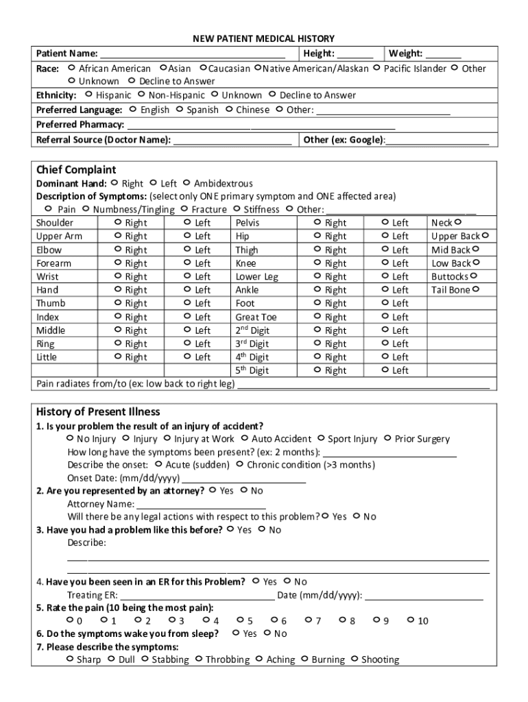NEW PATIENT MEDICAL HISTORY Patient Name: ___ Height: ___ Weight: ___ Race: African American Asian Caucasian Native American/Alaskan Pacific Islander Other Unknown Decline to Answer Ethnicity: Hispanic