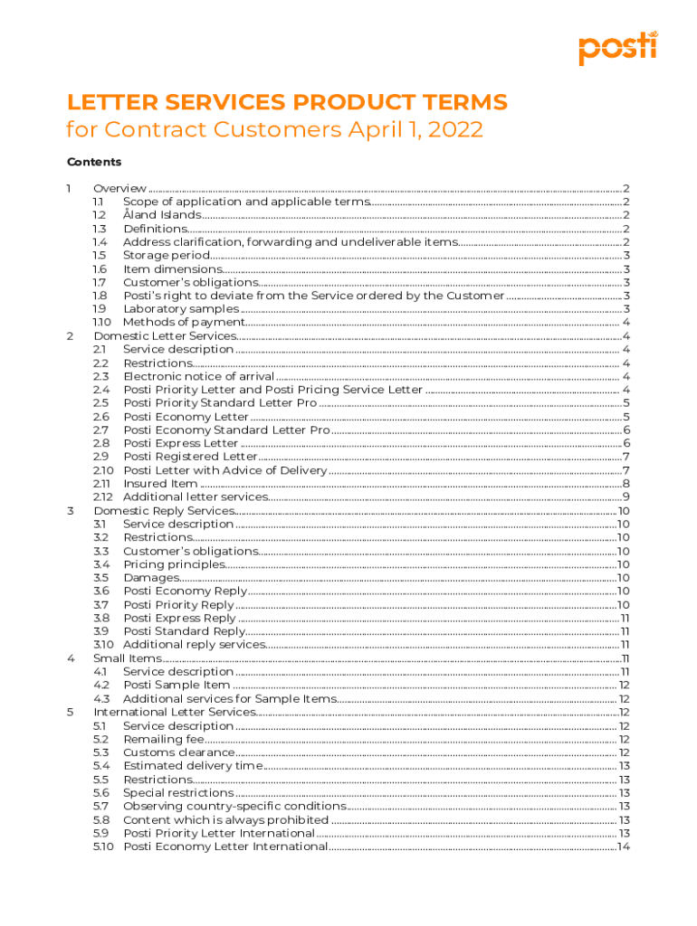 LETTER SERVICES PRODUCT TERMS for Contract Customers April 1, 2022, Contents 12345Overview ......................................................................................................................................................................................................