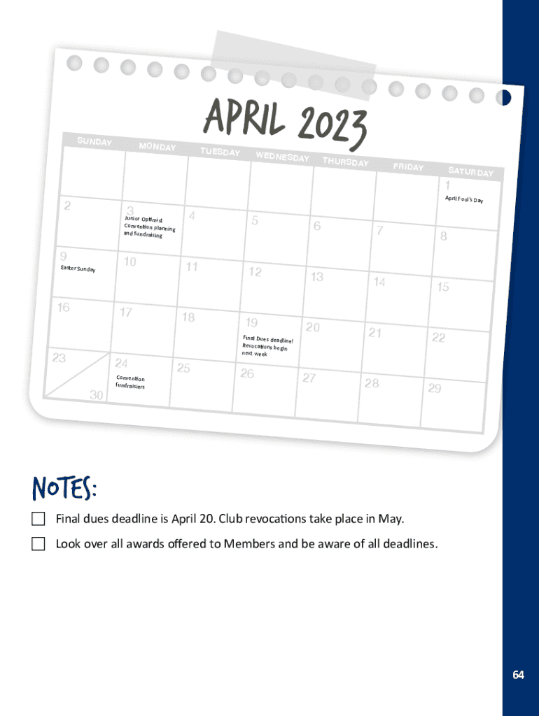 SUNDAYapril 2023MONDAYTUESDAYWEDNESDAYTHURSDAYFRIDAYSATURDAY1 23Junior Optimist Convention planning and fundraising9Easter Sunday1610 172324 30Convention fundraisiersApril Fools Day411 1856781213141519