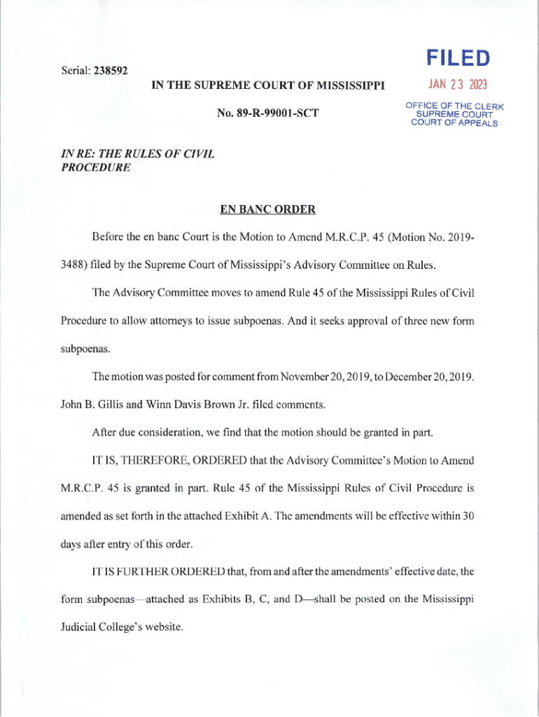 FILEDSerial: 238592 IN THE SUPREME COURT OF MISSISSIPPI No. 89R99001SCTJAN 23 2023 OFFICE OF THE CLERK SUPREME COURT OF APPEAL SIN RE: THE RULES OF CIVIL PROCEDURE EN BAND ORDER Before the en bane