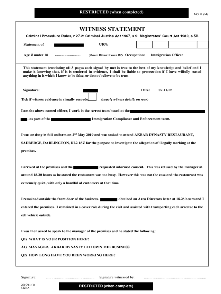 RESTRICTED (when completed)MG 11 (M)WITNESS STATEMENT Criminal Procedure Rules, r 27.2: Criminal Justice Act 1967, s.9: Magistrates Court Act 1980, s.5B Statement furn:Age if under 18...........................(if