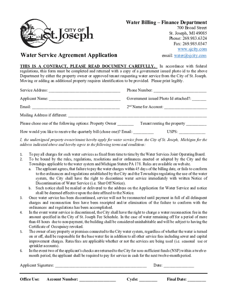 Water Billing Finance Department 700 Broad Street St. Joseph, MI 49085 Phone: 269.983.6324 Fax: 269.985.0347 www.sjcity.com email: water@sjcity.comWater Service Agreement Applications IS A CONTRACT,