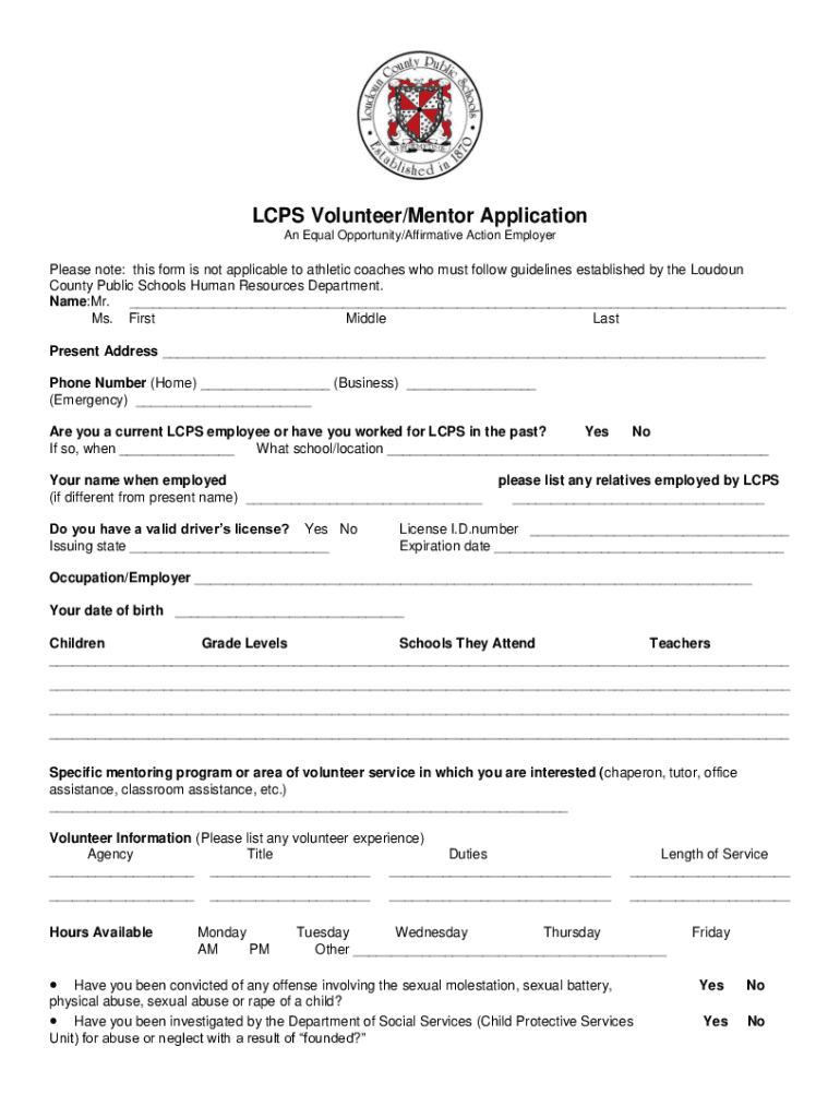 LAPS Volunteer/Mentor Application An Equal Opportunity/Affirmative Action EmployerPlease note: this form is not applicable to athletic coaches who must follow guidelines established by the Loudoun