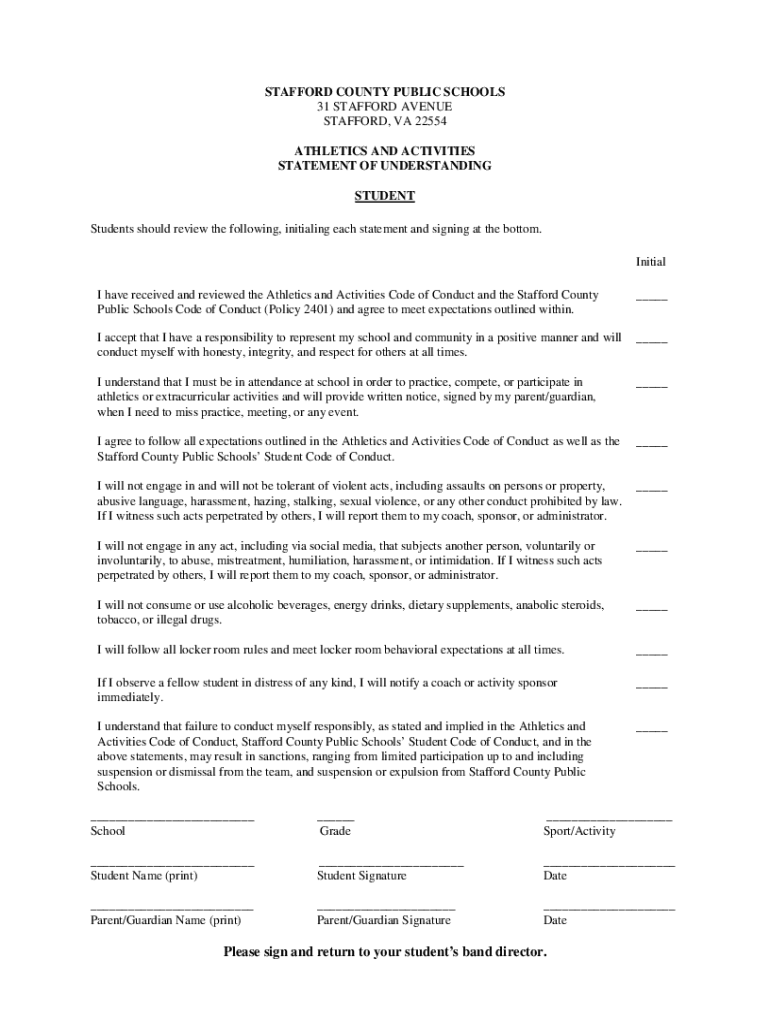 Stafford County Public SchoolsAthletics and Activities Code of Conduct Marching Band Signature Packet The following Stafford County Public Schools documents are attached: Athletics and Activities