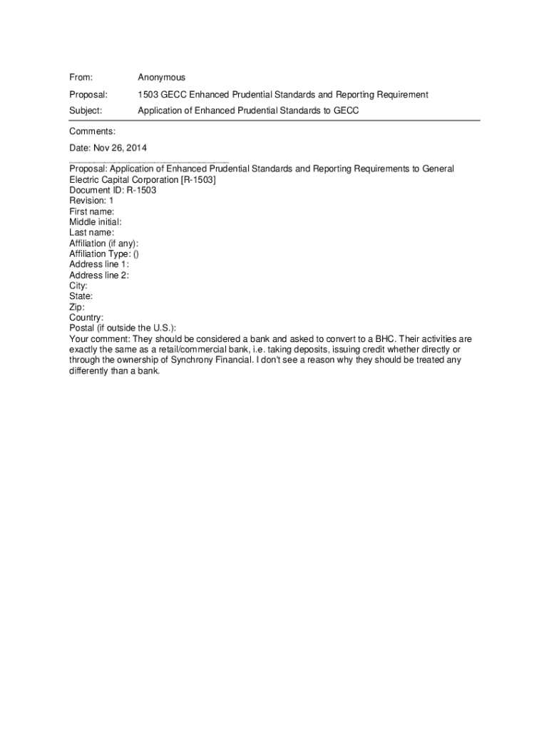 From:AnonymousProposal:1503 GCC Enhanced Prudential Standards and Reporting RequirementSubject:Application of Enhanced Prudential Standards to GECCComments: