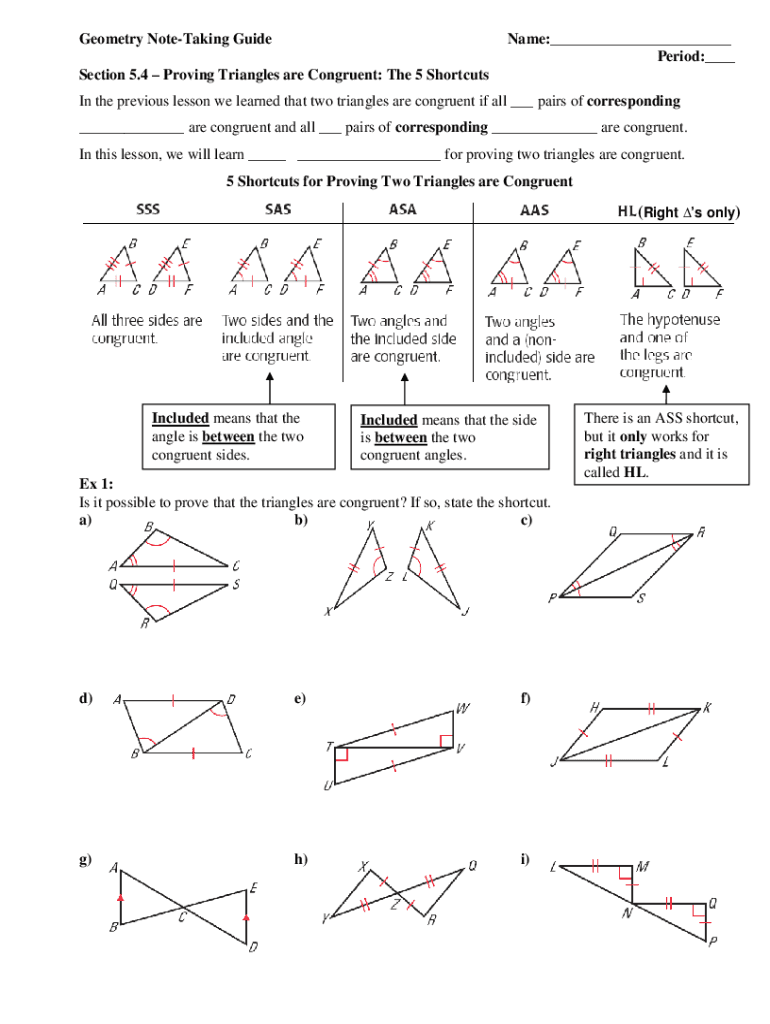 Geometry Note-taking Guidance:___ Period:___Section 5.4 Proving Triangles are Congruent: The 5 Shortcuts In the previous lesson we learned that two triangles are congruent if all ___ pairs of corresponding