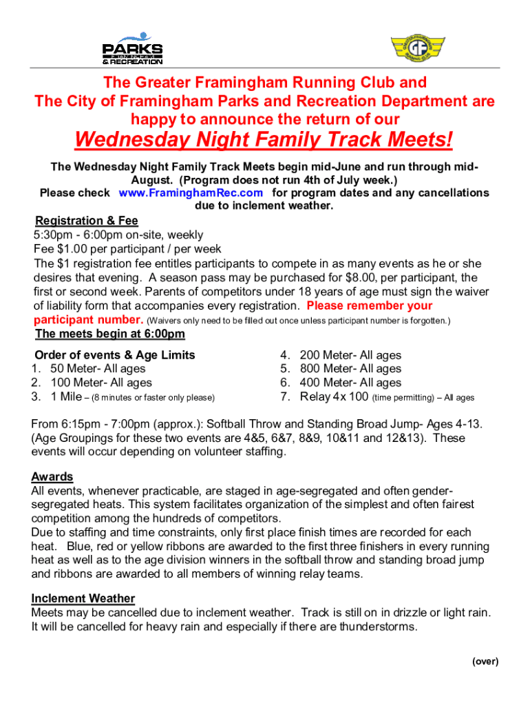 The Greater Framingham Running Club and The City of Framingham Parks and Recreation Department are happy to announce the return of our Wednesday Night Family Track Meets! The Wednesday Night Family
