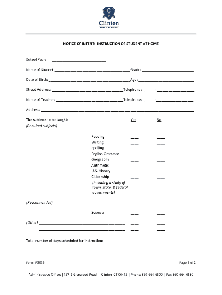 NOTICE OF INTENT: INSTRUCTION OF STUDENT AT HOME School Year:___Name of Student:___Grade: ___ Date of Birth: ___Age: ___ Street Address: ___Telephone: () ___Name of Teacher: ___Telephone: ()___Address: