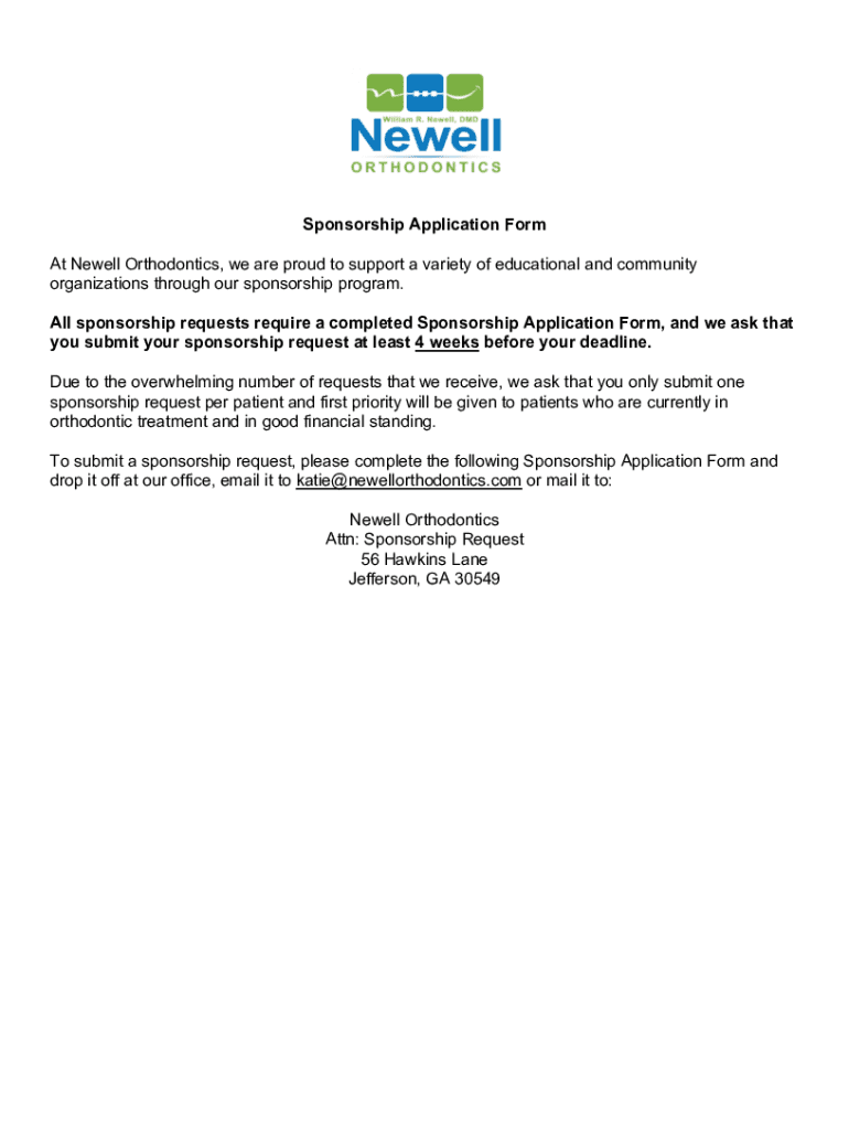 Sponsorship Application Form At Newell Orthodontics, we are proud to support a variety of educational and community organizations through our sponsorship program. All sponsorship requests require