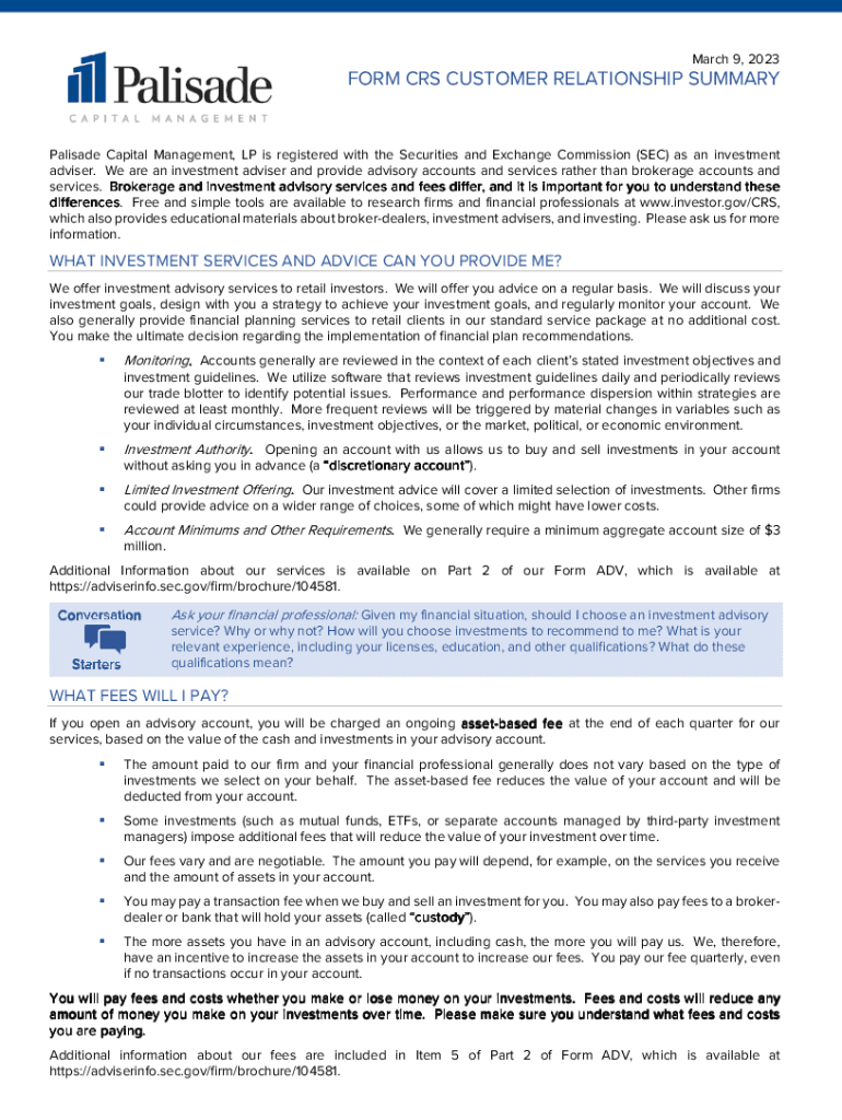 March 9, 2023FORM CRS CUSTOMER RELATIONSHIP SUMMARYPalisade Capital Management, LP is registered with the Securities and Exchange Commission (SEC) as an investment adviser. We are an investment adviser