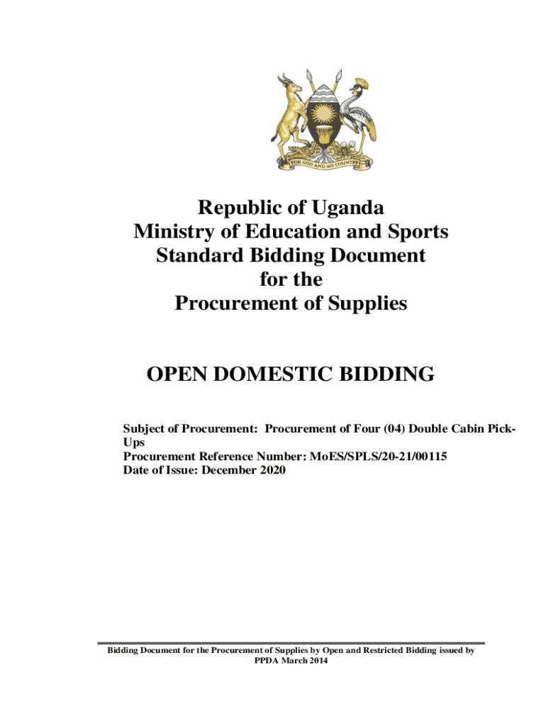 Republic of Uganda Ministry of Education and Sports Standard Bidding Document for the Procurement of SuppliesOPEN DOMESTIC BIDDING Subject of Procurement: Procurement of Four (04) Double Cabin Pickups