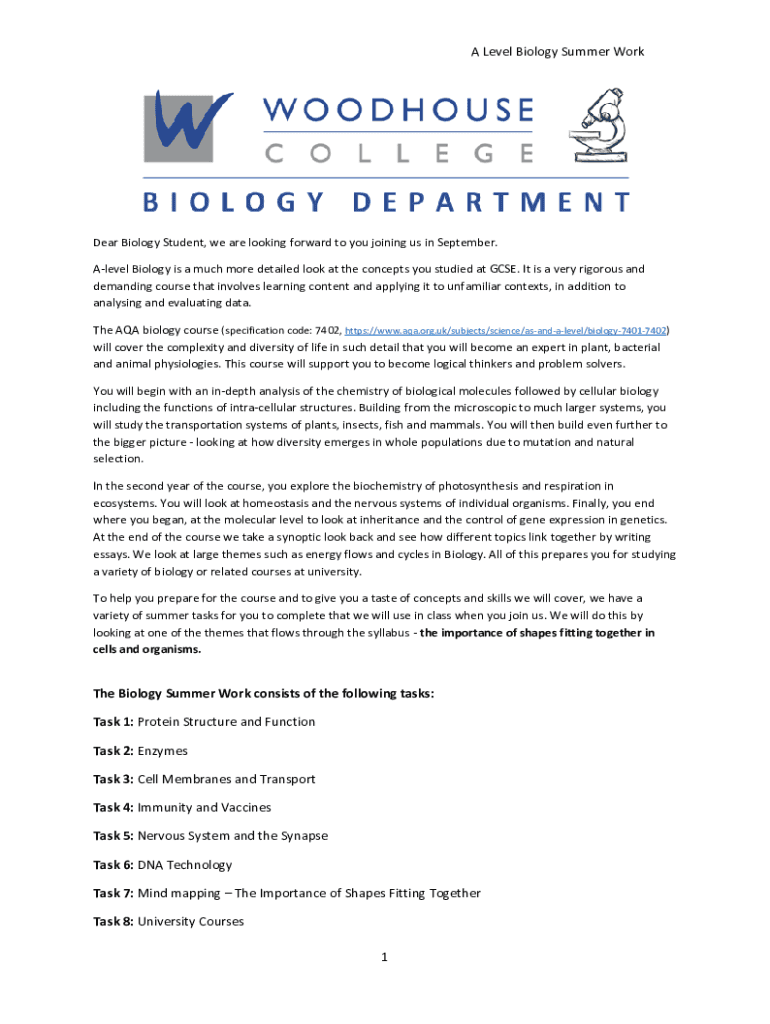 A Level Biology Summer Workfare Biology Student, we are looking forward to you joining us in September. Level Biology is a much more detailed look at the concepts you studied at GCSE. It is a very