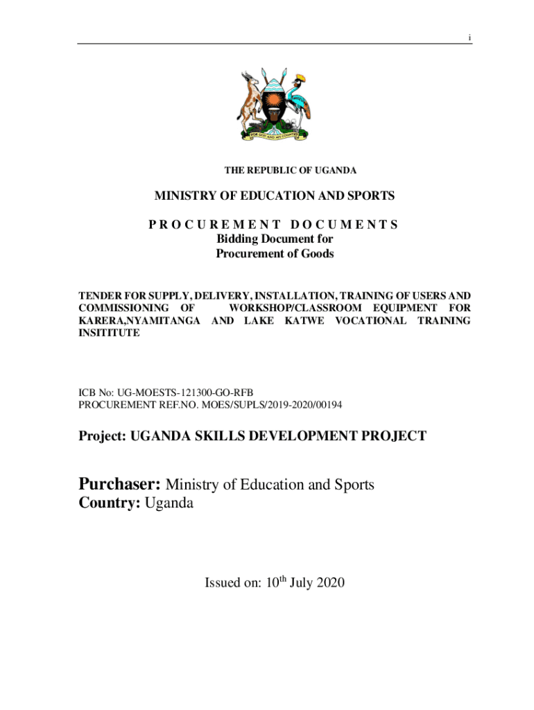 THE REPUBLIC OF UGANDAMINISTRY OF EDUCATION AND SPORTS PROCUREMENT DOCUMENTS Bidding Document for Procurement of Goods TENDER FOR SUPPLY, DELIVERY, INSTALLATION, TRAINING OF USERS AND COMMISSIONING