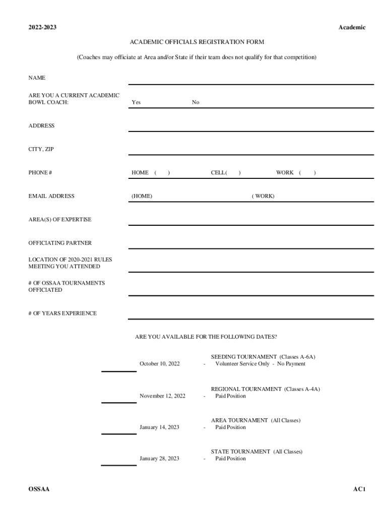 20222023Academic ACADEMIC OFFICIALS REGISTRATION FORM (Coaches may officiate at Area and/or State if their team does not qualify for that competition)NAME ARE YOU A CURRENT ACADEMIC BOWL COACH:YesNoADDRESSCITY,
