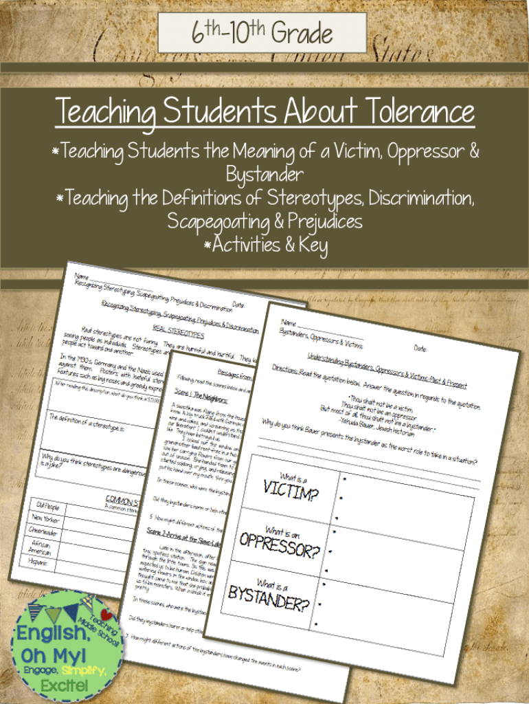 6th10th Reteaching Students About Tolerance *Teaching Students the Meaning of a Victim, Oppressor & Bystander *Teaching the Definitions of Stereotypes, Discrimination, Scapegoating & Prejudices *Activities