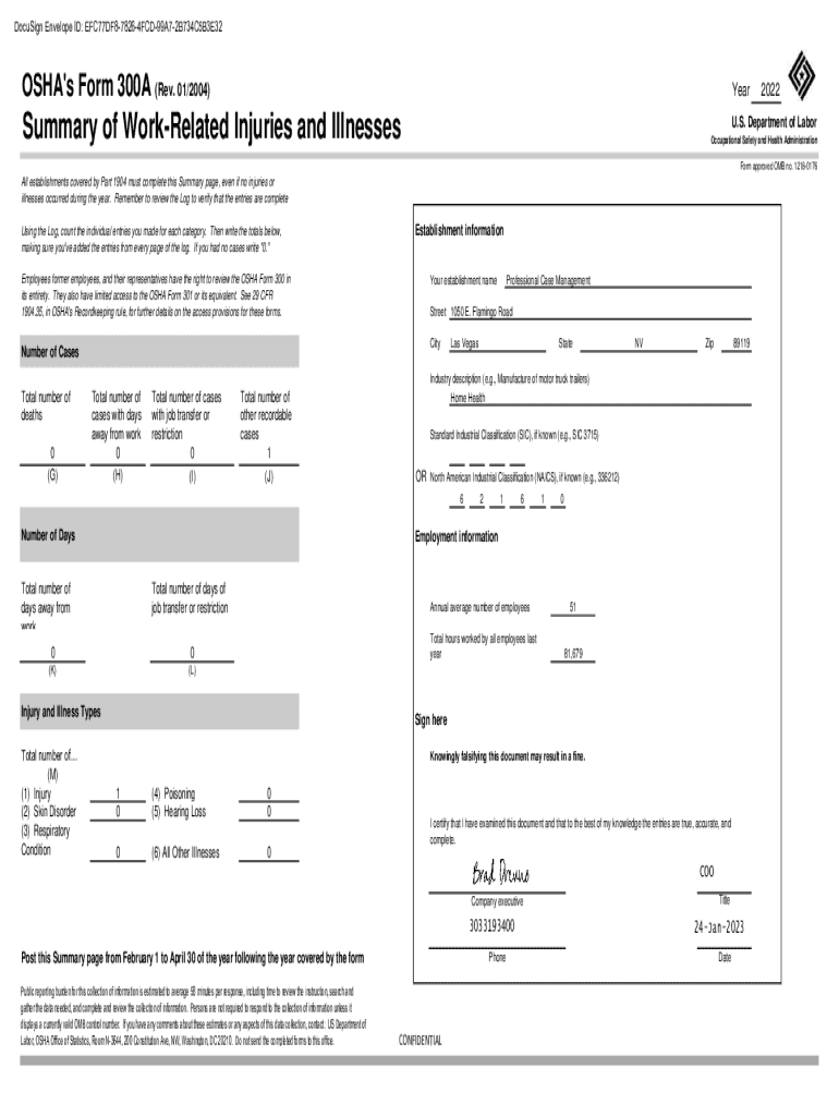 DocuSign Envelope ID: EFC77DF878264FCD99A72B734C5B3E32OSHA\'s Form 300A (Rev. 01/2004)YearSummary of Correlated Injuries and Illnesses2022U. S. Department of Labor