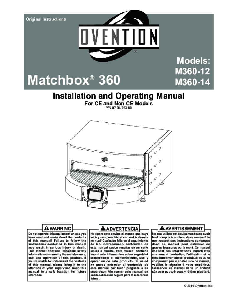 Original InstructionsModels: M36012 M36014Matchbox 360Installation and Operating Manual For CE and Nonce Models P/N 07.04.763.00WARNINGDo not operate this equipment unless you have read and understood