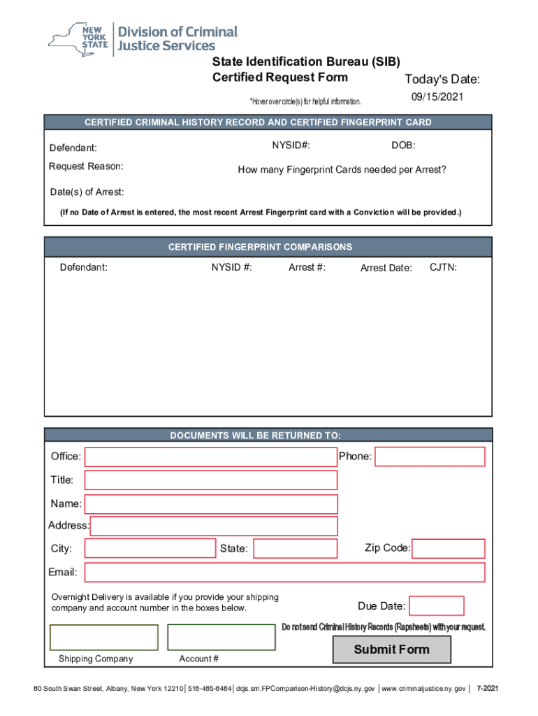 State Identification Bureau (SIB) Certified Request Form Today\'s Date: 09/15/2021×Hover over circle(s) for helpful information. CERTIFIED CRIMINAL HISTORY RECORD AND CERTIFIED FINGERPRINT CARD DOB:NY