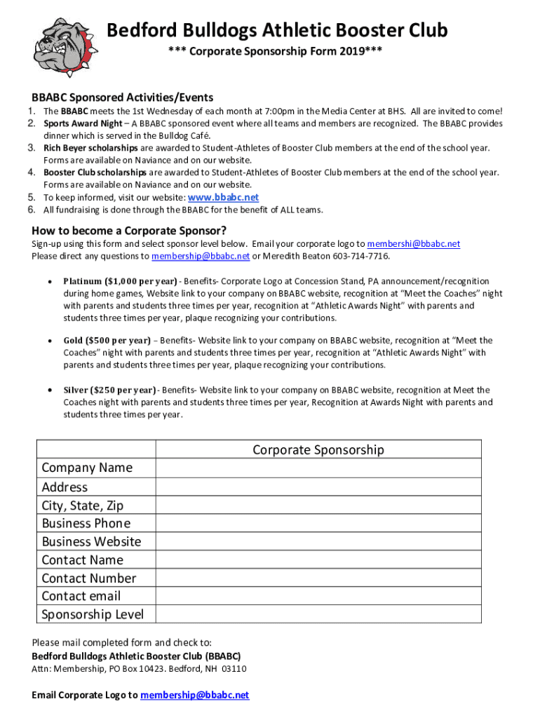 Bedford Bulldogs Athletic Booster Club *** Corporate Sponsorship Form 2019***BB ABC Sponsored Activities/Events 1. The BB ABC meets the 1st Wednesday of each month at 7:00pm in the Media Center at