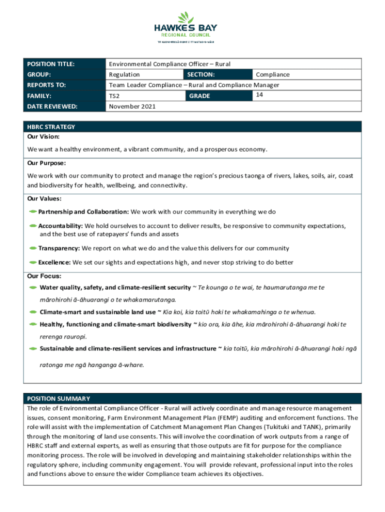 POSITION TITLE:Environmental Compliance Officer RuralGROUP:RegulationREPORTS TO: