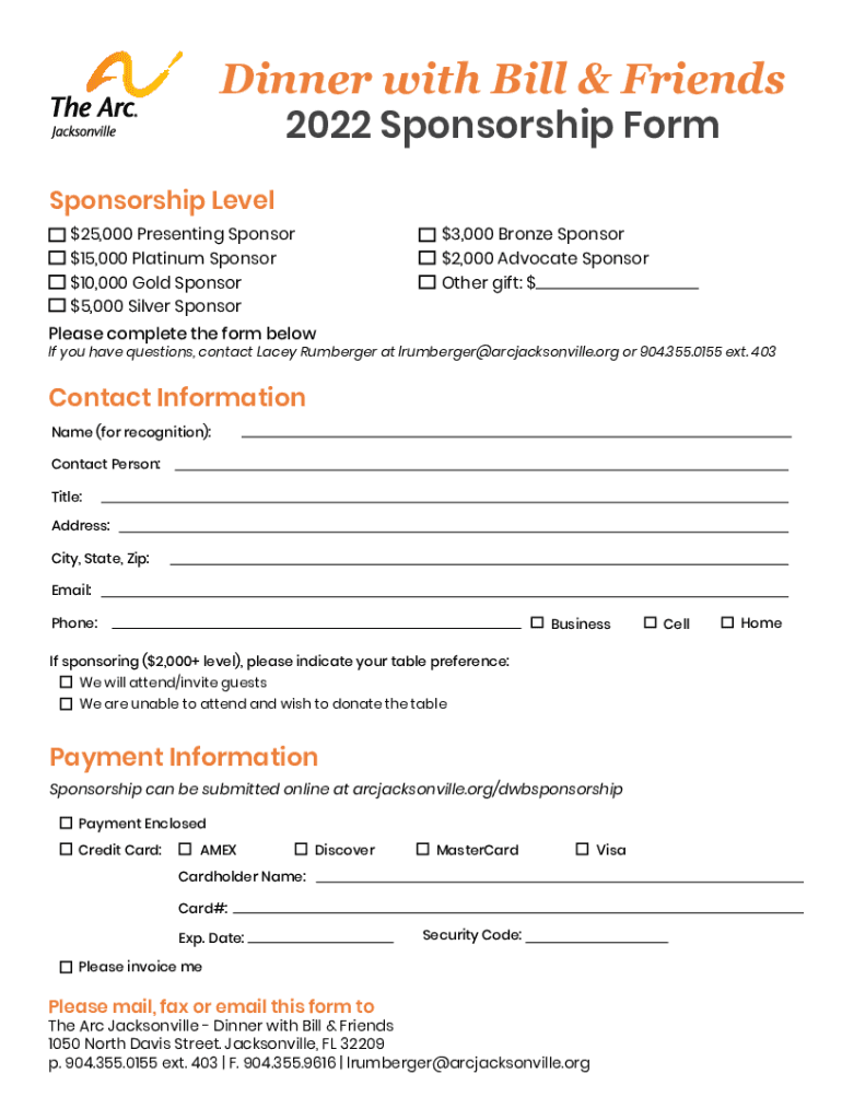 Dinner with Bill & Friends Sponsorship PackageBenefitting The Arc Jacksonville and individuals with intellectual and developmental differences Travis Cummings, Crevice President, The Bailey Group