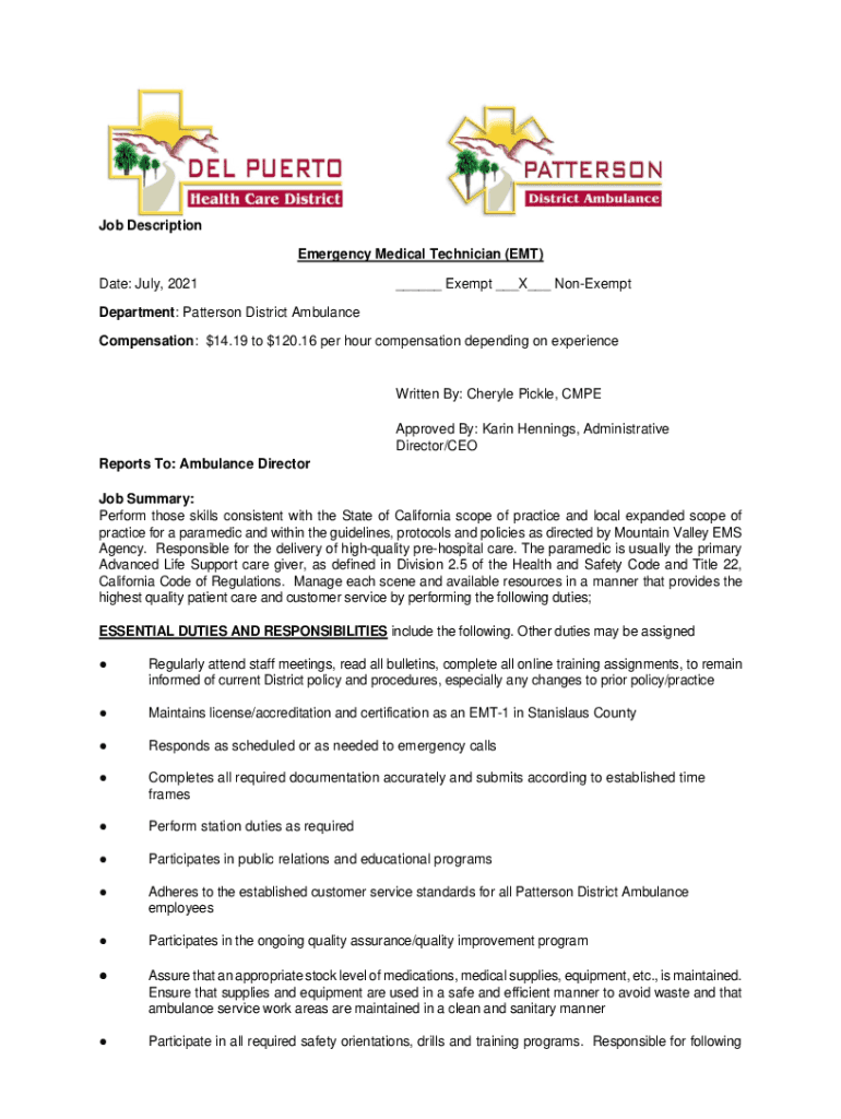 Get the free Job Description Emergency Medical Technician (EMT) Date