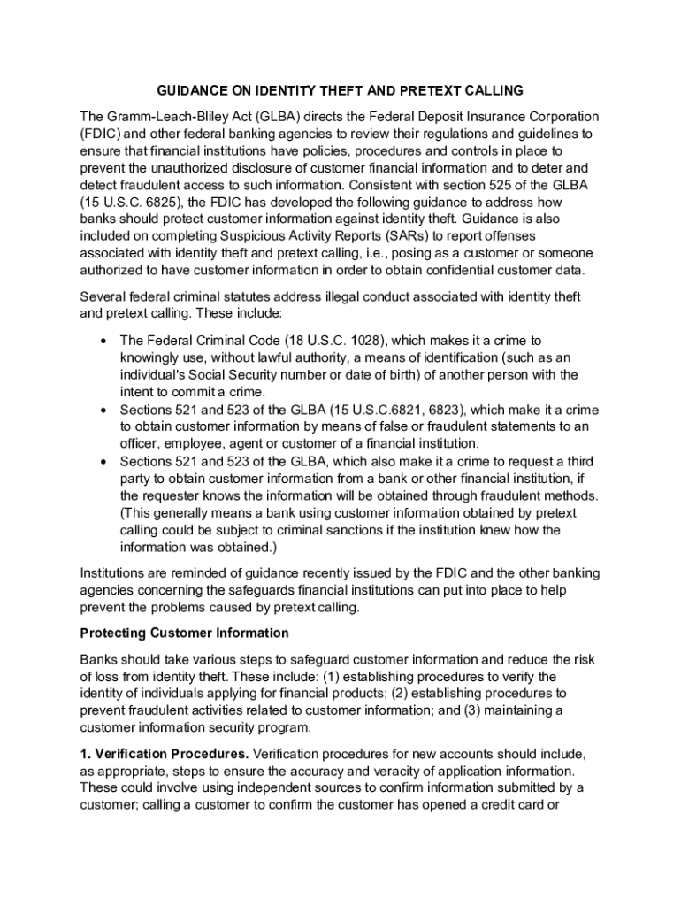 GUIDANCE ON IDENTITY THEFT AND PRETEXT CALLING The GrammLeachBliley Act (ALBA) directs the Federal Deposit Insurance Corporation (FDIC) and other federal banking agencies to review their regulations