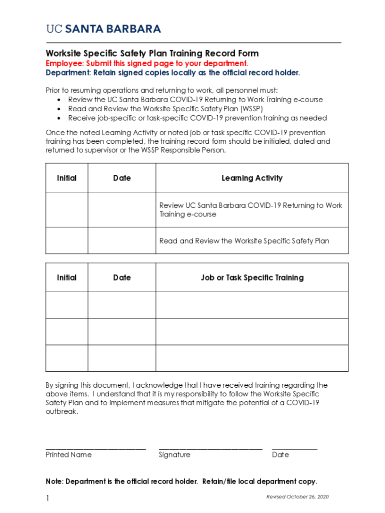 Worksite Specific Safety Plan Training Record FormEmployee: Submit this signed page to your department. Department: Retain signed copies locally as the official record holder. Prior to resuming operations