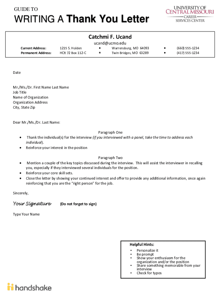 GUIDE to COWRITING A Thank-you Letter YOUR LETTERHEAD Catch mi F. UCAD ucand@ucmo.edu Current Address: Permanent Address:1215 S. Holden HER 72 Box 112C Warrens burg, MO 64093 Twin Bridges, MO 63289