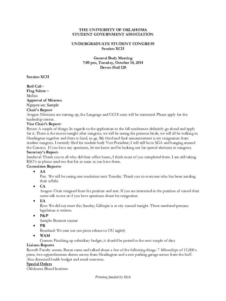 THE UNIVERSITY OF OKLAHOMA STUDENT GOVERNMENT ASSOCIATION UNDERGRADUATE STUDENT CONGRESS Session XCII General Body Meeting 7:00 pm, Tuesday, October 14, 2014, Devon Hall 120 Session XCII Roll Call