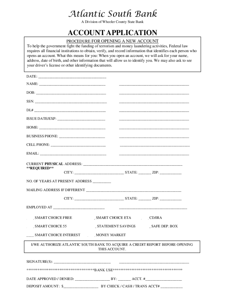 Atlantic South Bank A Division of Wheeler County State BankACCOUNT APPLICATION PROCEDURE FOR OPENING A NEW ACCOUNT To help the government fight the funding of terrorism and money laundering activities,