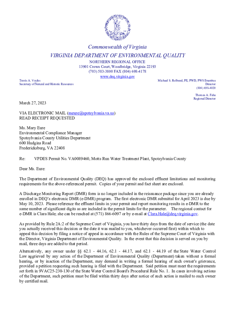 Commonwealth of Virginia DEPARTMENT OF ENVIRONMENTAL QUALITY NORTHERN REGIONAL OFFICE 13901 Crown Court, Woodbridge, Virginia 22193 (703) 5833800 FAX (804) 6984178 www.deq.virginia.gov Travis A. Voles