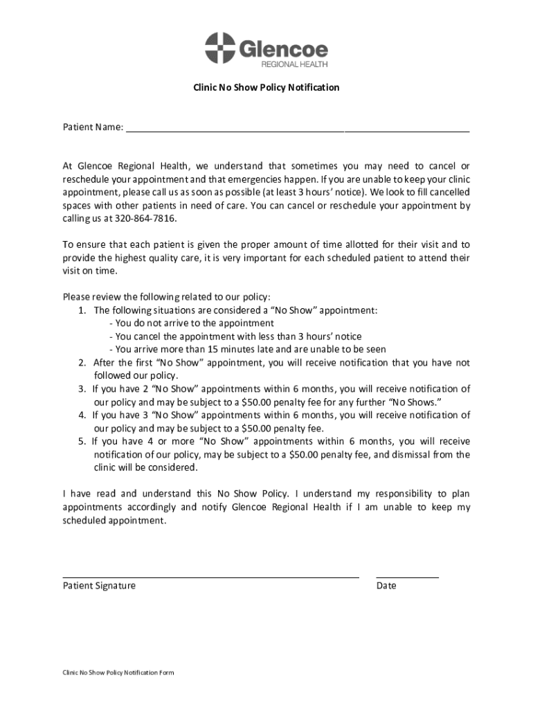 Clinic No Show Policy Notification Patient Name: ___ At Glencoe Regional Health, we understand that sometimes you may need to cancel or reschedule your appointment and that emergencies happen. If