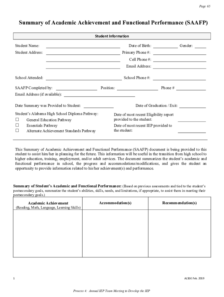 Page 65Summary of Academic Achievement and Functional Performance (SAAF) StudentInformation Student Name:Date of Birth:Student Address:Gender:Primary Phone #: Cell Phone #: Email Address:School Attended:School
