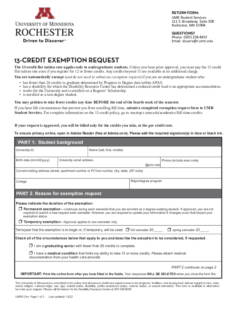 RETURN FORM: UMR Student Services 111 S. Broadway, Suite 300 Rochester, MN 55904 QUESTIONS? Phone: (507) 2588457 Email: stuserv@r.umn.edu13CREDIT EXEMPTION REQUEST The 13credit flat tuition rate applies