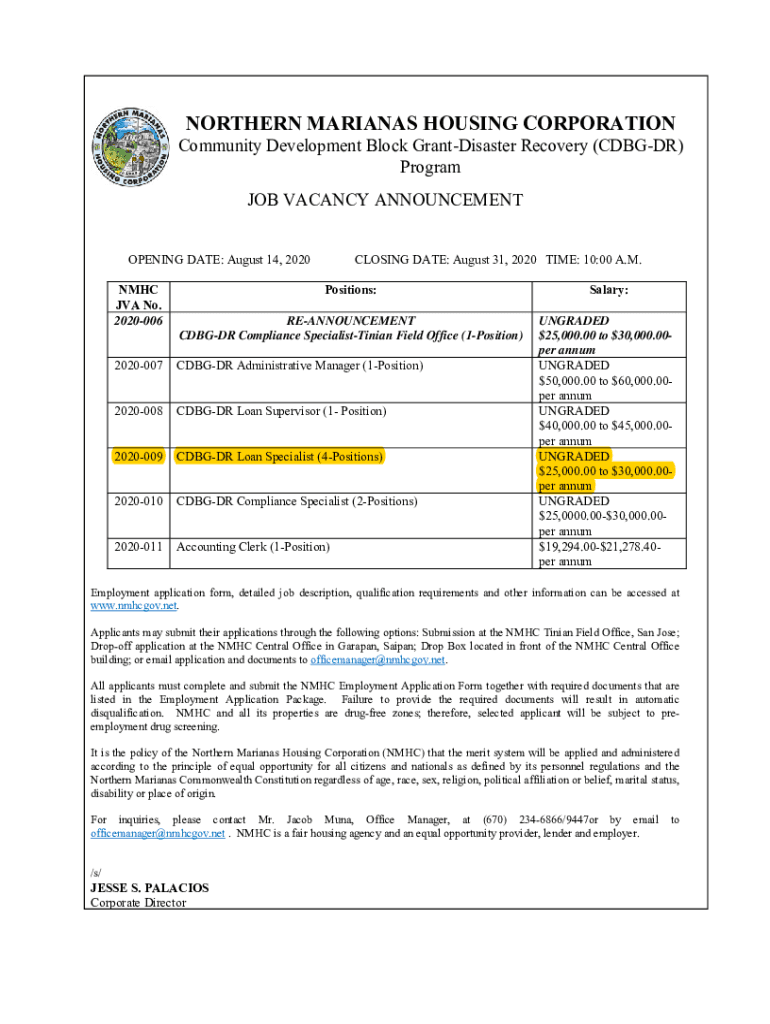 NORTHERN MARIANAS HOUSING CORPORATION Community Development Block GrantDisaster Recovery (CDB GDR) Program JOB VACANCY ANNOUNCEMENT OPENING DATE: August 14, 2020, MHC JAVA No. 2020006CLOSING DATE: