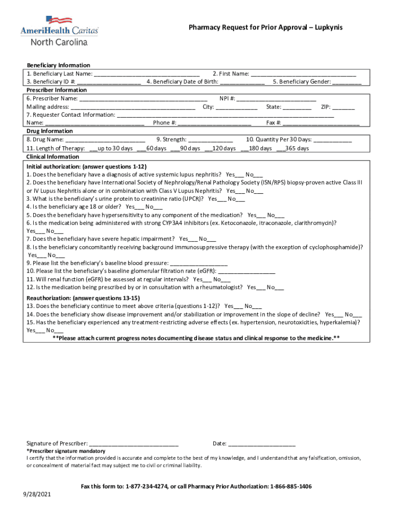 Pharmacy Request for Prior to Approval LupkynisBeneficiary Information 1. Beneficiary Last Name: ___ 2. First Name: ___ 3. Beneficiary ID #: ___ 4. Beneficiary Date of Birth: ___ 5. Beneficiary Gender: