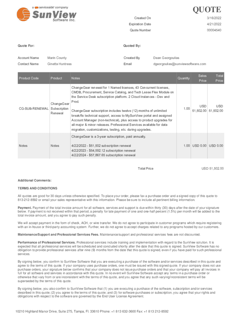 QUOTEQuote For:Created On3/16/2022Expiration Date4/21/2022Quote Number00004540Quoted By:Account Name Marin CountyCreated By Dean GeorgouliasContact NameGinetta HuntressEmaildgeorgoulias@sunviewsoftware.comProduct