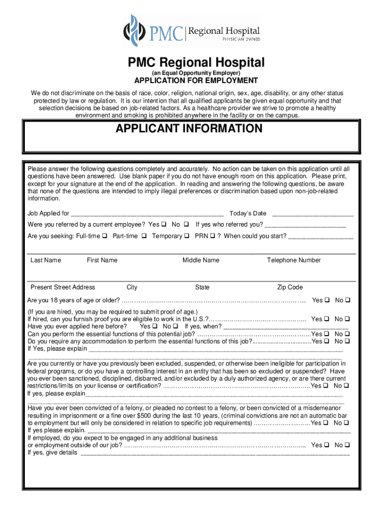 PMC Regional Hospital (an Equal Opportunity Employer)APPLICATION FOR EMPLOYMENT We do not discriminate on the basis of race, color, religion, national origin, sex, age, disability, or any other status