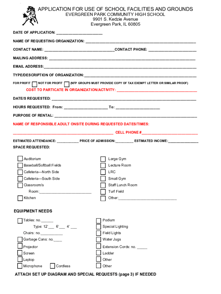 APPLICATION FOR USE OF SCHOOL FACILITIES AND GROUNDS EVERGREEN PARK COMMUNITY HIGH SCHOOL 9901 S. Kenzie Avenue Evergreen Park, IL 60805DATE OF APPLICATION: ___ NAME OF REQUESTING ORGANIZATION: ___