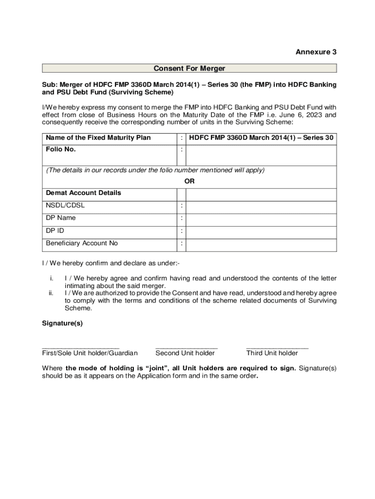 Appendix 3 Consent For Merger Sub: Merger of HDFC FMP 3360D March 2014(1) Series 30 (the FMP) into HDFC Banking and PSU Debt Fund (Surviving Scheme) I/We hereby express my consent to merge the FMP