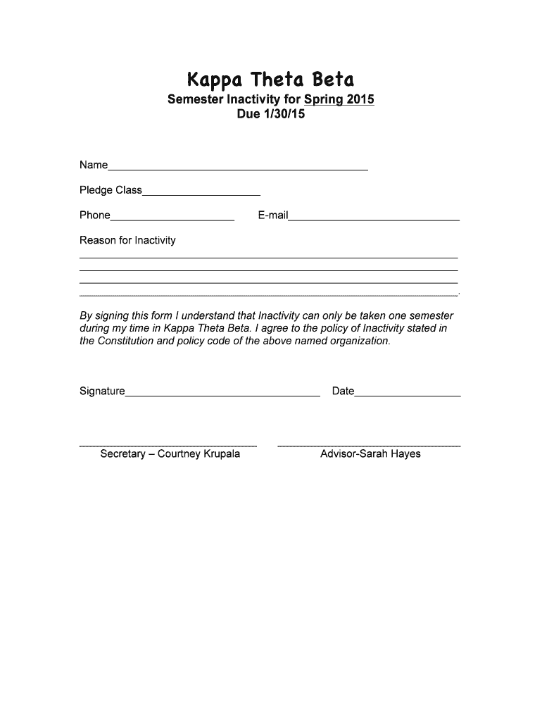 Kappa Theta Beta Semester Inactivity for Spring 2015 Due 1/30/15 Name Pledge Class Phone E-mail Reason for Inactivity. By signing this form I understand that Inactivity can only be taken one semester