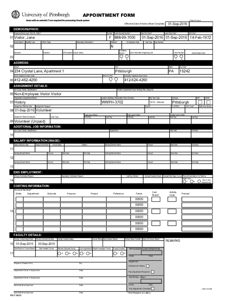 APPOINTMENT FORM Date of IssueEffective Date of Action (Must Complete)01Sep2016DEMOGRAPHICS: Employee Name (Last, First, MI, Suffix)*01Gender* Social Security Number×Visitor, Mandate First Hired×F