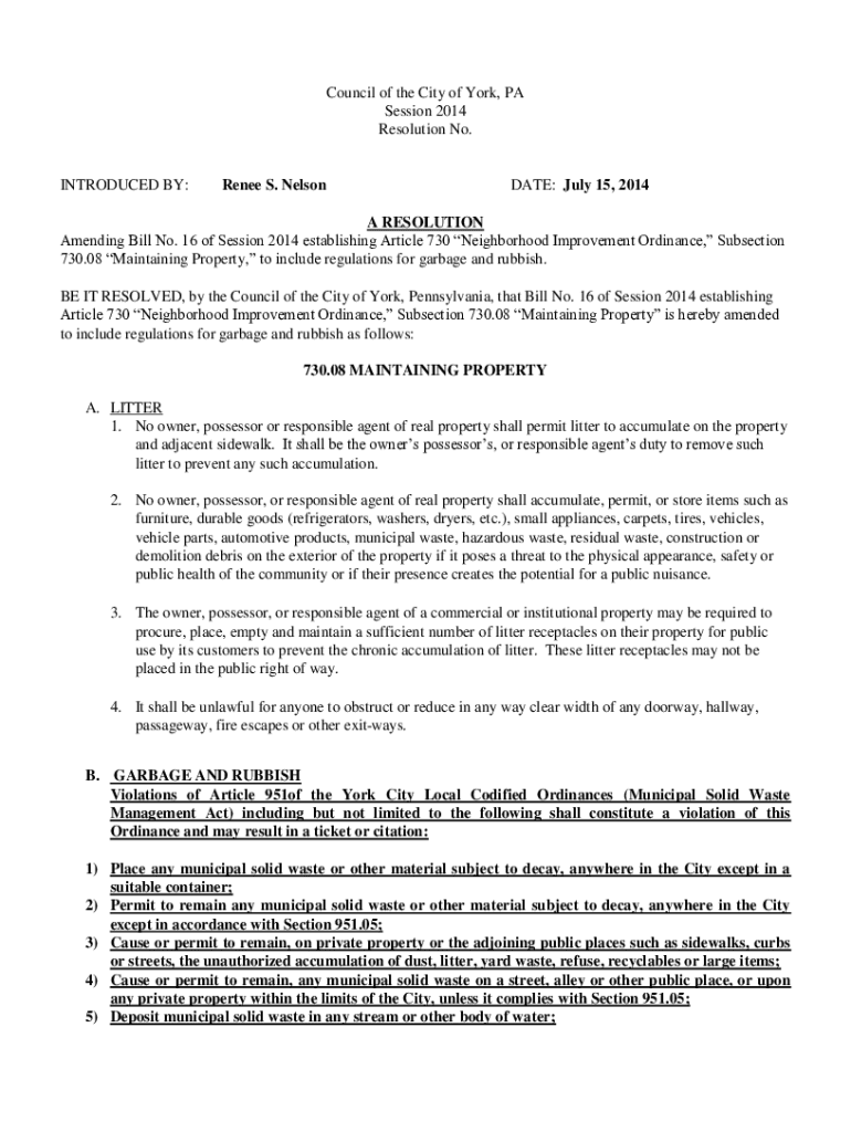 Council of the City of York, PA Session 2014 Resolution No. INTRODUCED BY:Renee S. Elongate: July 15, 2014A RESOLUTION Amending Bill No. 16 of Session 2014 establishing Article 730 Neighborhood Improvement