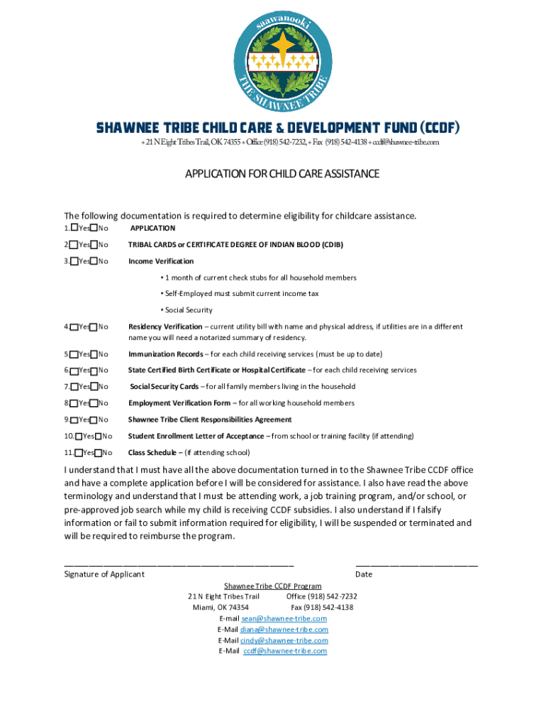 + 21 N Eight Tribes Trail, OK 74355 + Office (918) 5427232, + Fax (918) 5424138 + ccdf@shawneetribe.comAPPLICATION FOR CHILD CARE ASSISTANCE