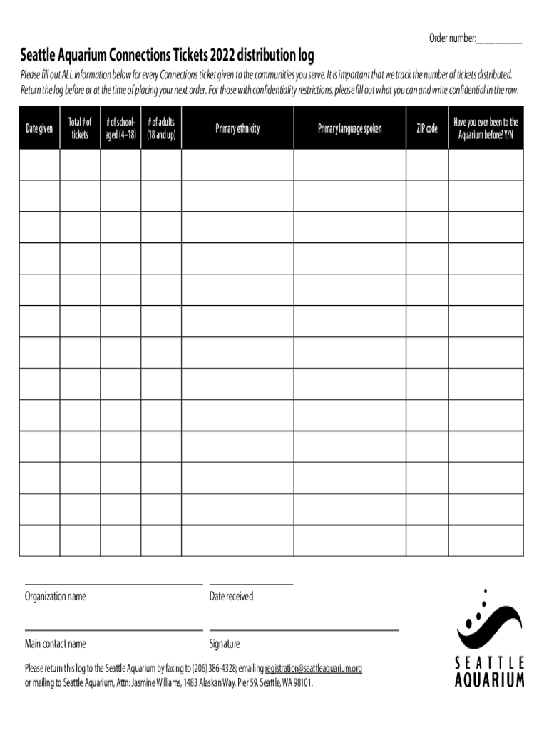 Order number:___Seattle Aquarium Connections Tickets 2022 distribution please fill out ALL information below for every Connection's ticket given to the communities you serve. It is important that