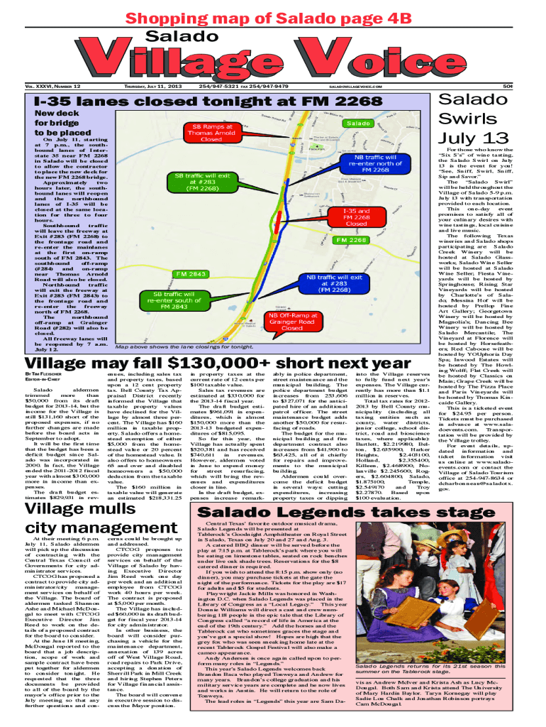 Shopping map of Salado page 4B SaladoVillage Voice. XXXVI, Number 12Thursday, July 11, 2013254/9475321fax 254/9479479saladovillagevoice.comI35 lanes closed tonight at FM 2268 New deck for bridge to